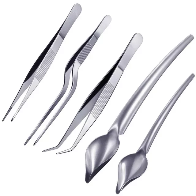 This premium set includes 3 precision tweezers and 2 drawing spoons—a complete kit for creative plating. Each tweezer is crafted with serrated tips to ensure a secure grip, ideal for handling delicate herbs, microgreens, or edible flowers. The drawing spoons come in two sizes: the smaller spoon is perfect for creating fine lines or tiny dots, while the larger spoon is made for bold strokes and thicker sauces.
