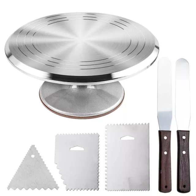The rotating cake turntable stand is made from heavy-duty aluminum alloy for exceptional stability. Its non-slip surface and silicone base keep your cake steady while you work—no more slipping or sliding as you smooth and decorate. The set also includes both stainless steel and plastic scrapers for maximum versatility and precision. With 12 creative edge patterns, you can effortlessly design textured finishes and professional-looking borders. The included 6-inch spatula helps you spread frosting evenly and decorate with ease.
