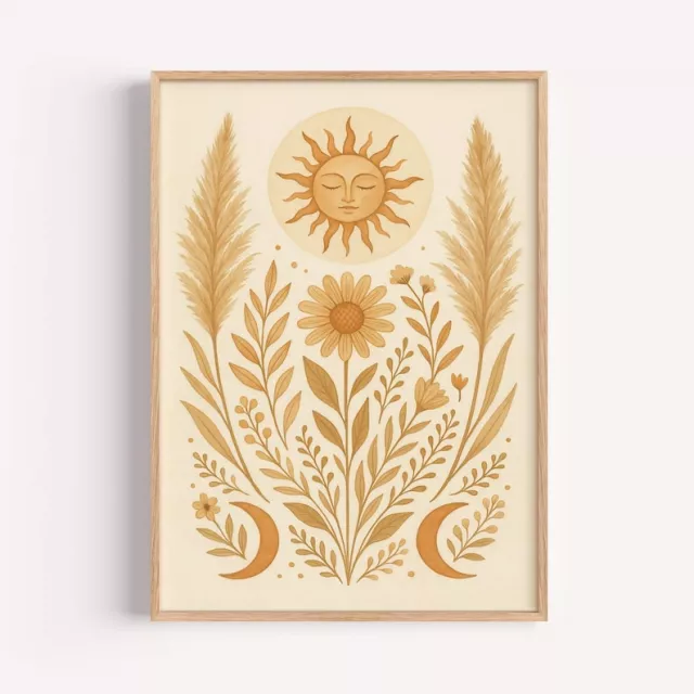Transform your living space into a serene sanctuary with our stunning Boho Sun Wall Art. This captivating celestial botanical print beautifully combines the elements of nature with whimsical art, making it the perfect addition to your bedroom, nursery, or any space that needs a touch of warmth and charm. The enchanting design features a floral moon and sun, creating a harmonious atmosphere that invites relaxation and inspiration.