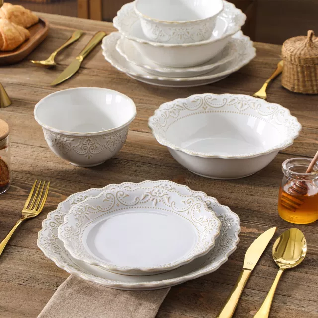 Transform every meal into a special occasion with this 16 pieces white stoneware dinnerware set. Designed with a sophisticated relief pattern, this set adds a touch of elegance and charm to your dining table. Perfect for both casual dinners and festive gatherings, it’s the ideal choice for families, couples, or anyone who appreciates beautiful, functional tableware. Crafted from durable stoneware, it offers the perfect balance of style and practicality for everyday use.