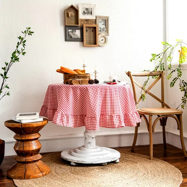 Bring the charm of farmhouse style to your home with this Farmhouse Red & White Plaid Ruffle Tablecloth. Featuring a classic gingham design and a delicate ruffled edge, this vintage checkered tablecloth is perfect for adding warmth and style to any dining space. Whether it’s a casual family meal or a formal wedding reception, this tablecloth is versatile enough to suit any occasion. Made from high-quality cotton linen, it’s both durable and comfortable, offering you a lasting and stylish solution to table decor.